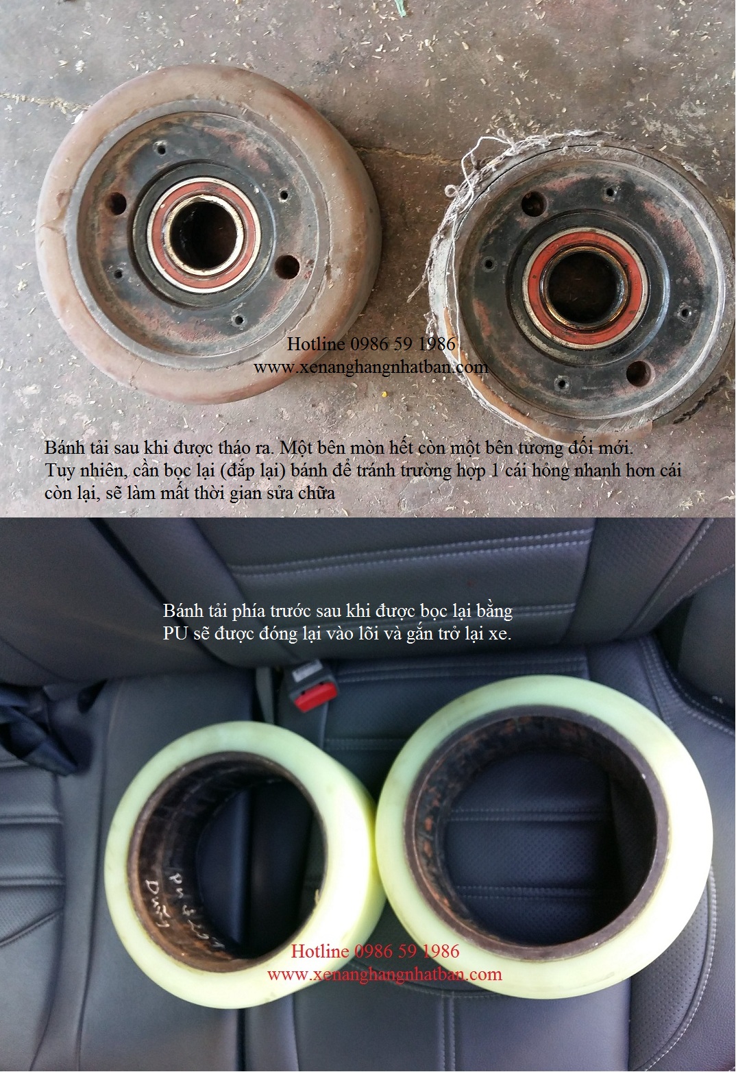 - Bọc lại bánh cũ đã mòn (phần cốt thép giữ nguyên, chỉ bọc mới PU hoặc cao su bên ngoài). Chi phí sẽ rẻ hơn nhiều so với việc mua bánh mới.