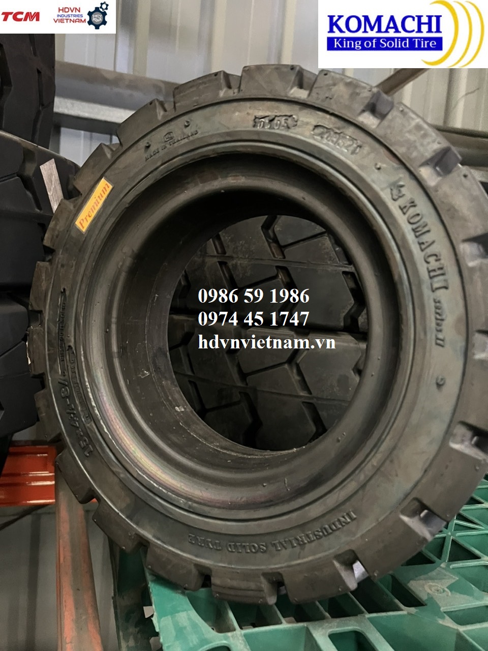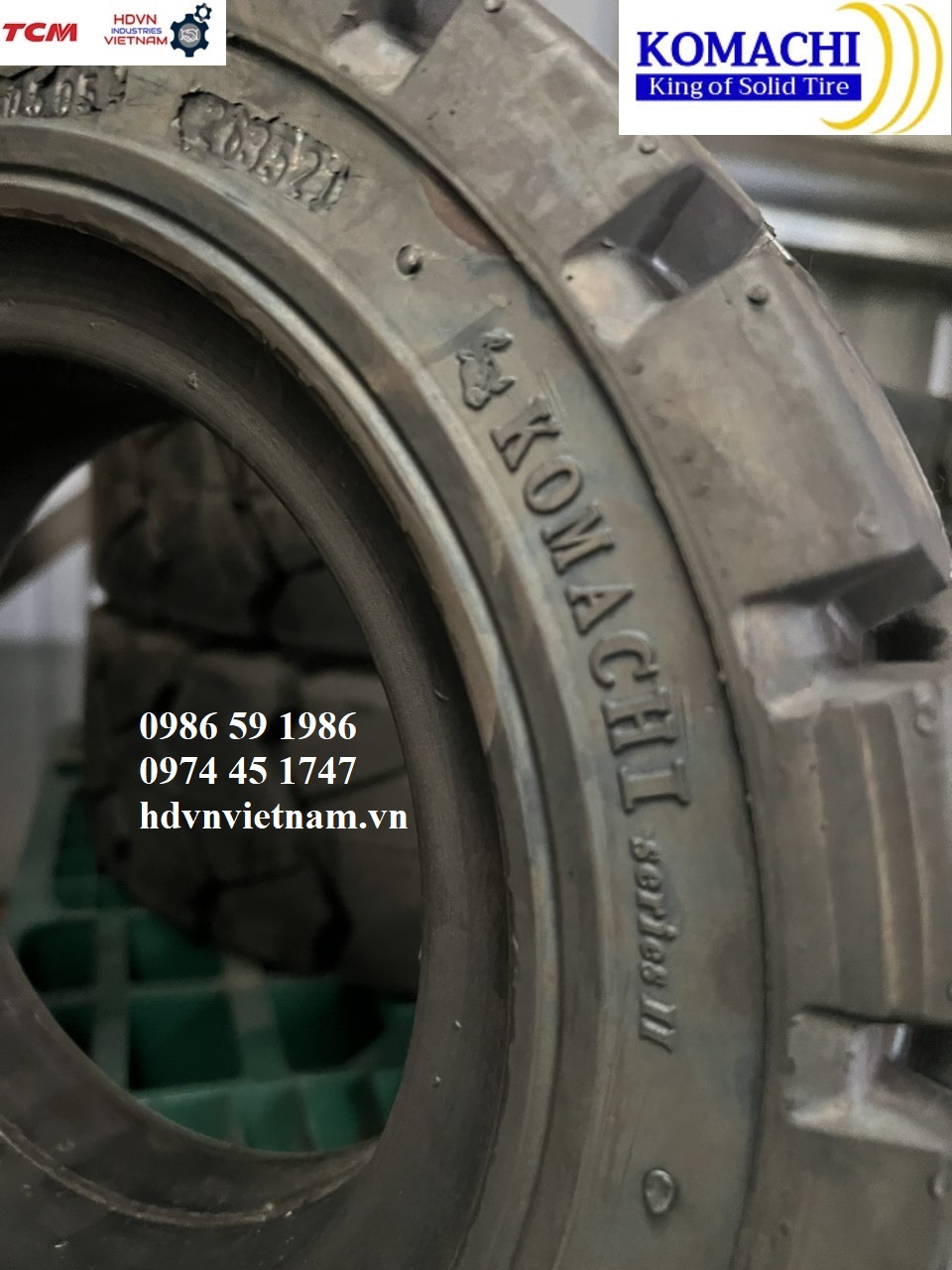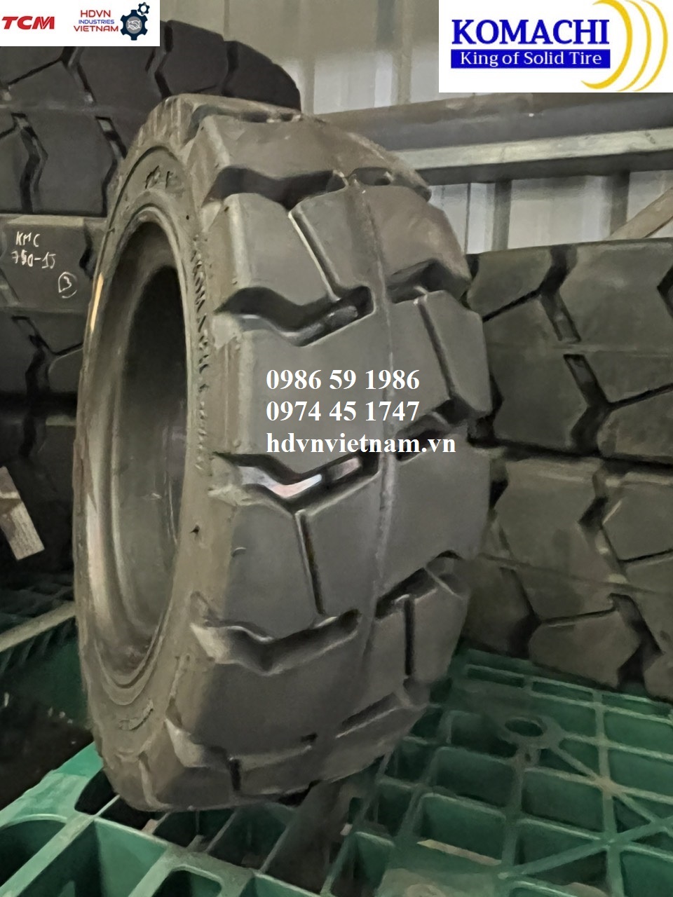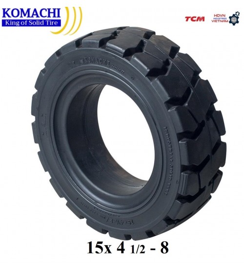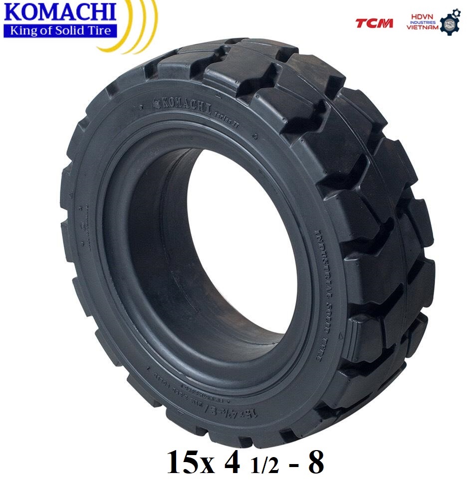THÔNG SỐ KỸ THUẬT CƠ BẢN - Lốp đặc Komachi 15x4.5-8 - Mới 100%, sản xuất tại Thái Lan - Mã lốp 15x4.5-8, 15x4 ½-8 - Sử dụng la răng 3.00-8 - Bề rộng lốp 110mm - Đường kính ngoài 370mm - Tải trọng khi lắp cho bánh tải phía trước 1040kg - Tải trọng khi lắp cho bánh lái phía sau 800kg | SPECIFICATION - Komachi 15x4.5-8 Cushion Tire - Brand new 100%. Made in Thailand - Size 15x4.5-8, 15x4 ½-8 - Wheel rim 3.00-8 - Tire width 110mm - Outside diameter 370mm - Load capacity use for loading tires 1040kg - Load capacity use for steering tires 800kg |