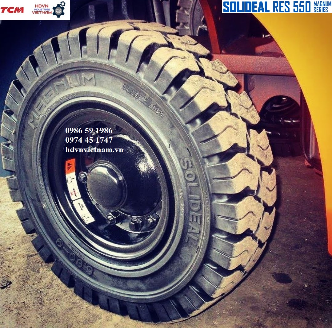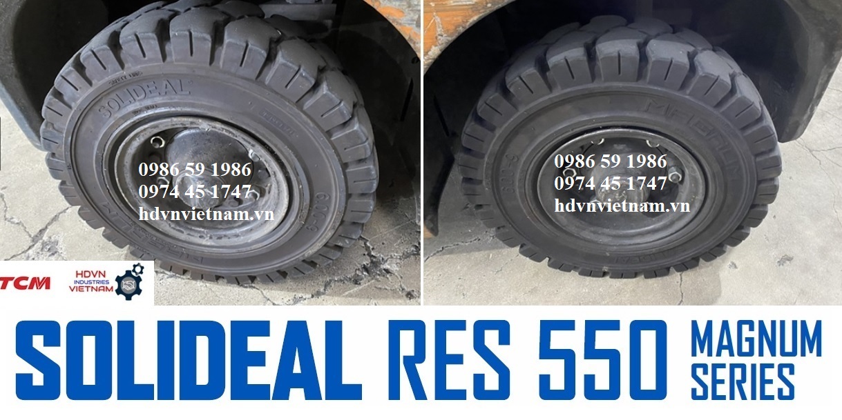 - Lốp đặc Solideal RES 550 Magnum: xe nâng chạy 8~15h/ngày, có càng kẹp nặng, xe leo container