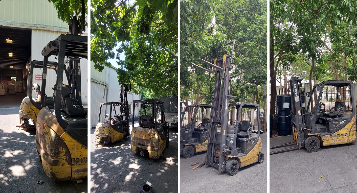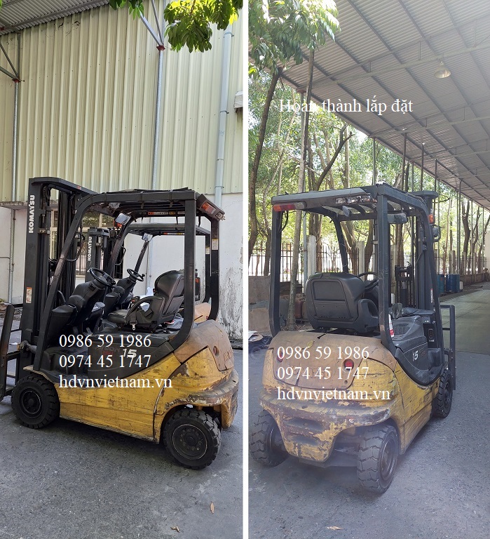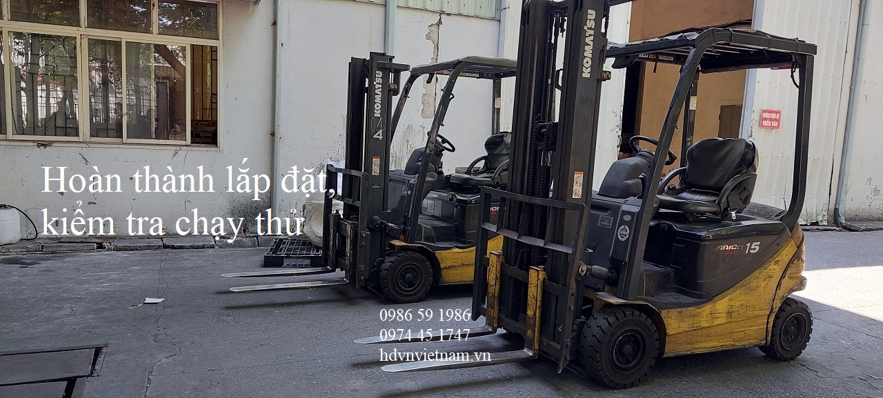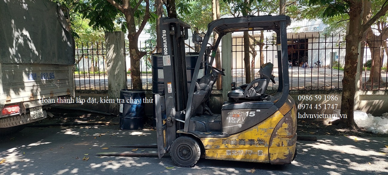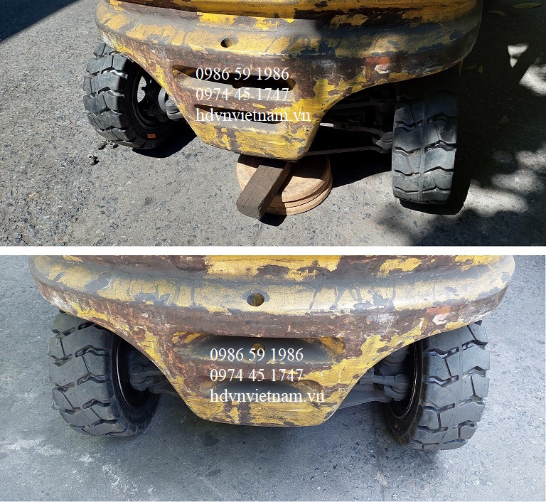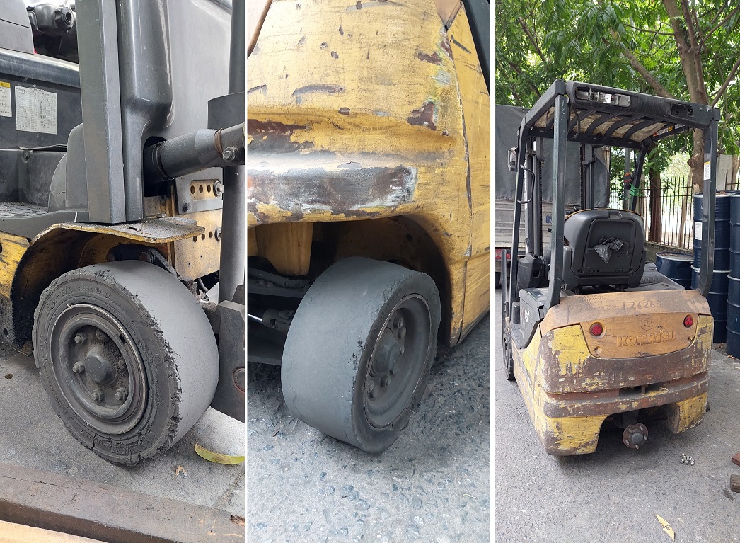 - Hai xe nâng điện ngồi lái Komatsu đã bị mòn lốp và cần