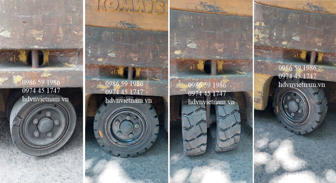 Còn hai lốp đặc Komachi 15x4.5-8 (còn gọi là lốp xe nâng 15x4 1/2-8) được lắp cho xe nâng điện ngồi lái Komatsu FB15M-12. Bánh này thường nhanh mòn hơn 4 quả ở trên, vì được lắp vào chính giữa xe, bản nhỏ, đánh lái nhiều, chịu tải lớn.