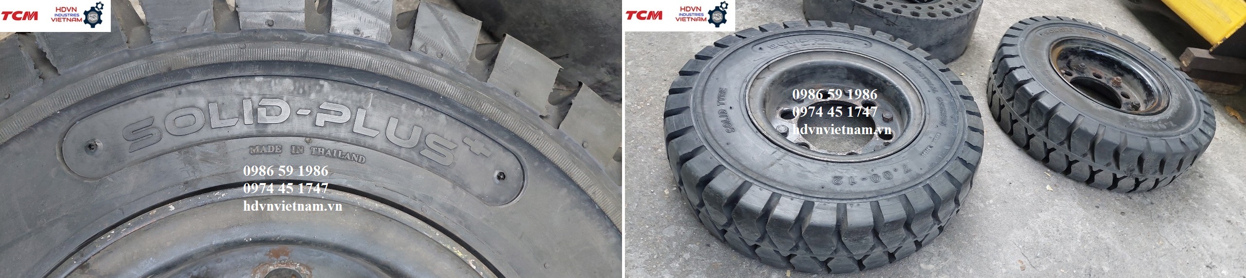 - Thay lốp đặc mới 100%, lốp SolidPlus 700-12 xuất xứ Thái Lan. Đây là dòng lốp xe nâng giá rẻ.