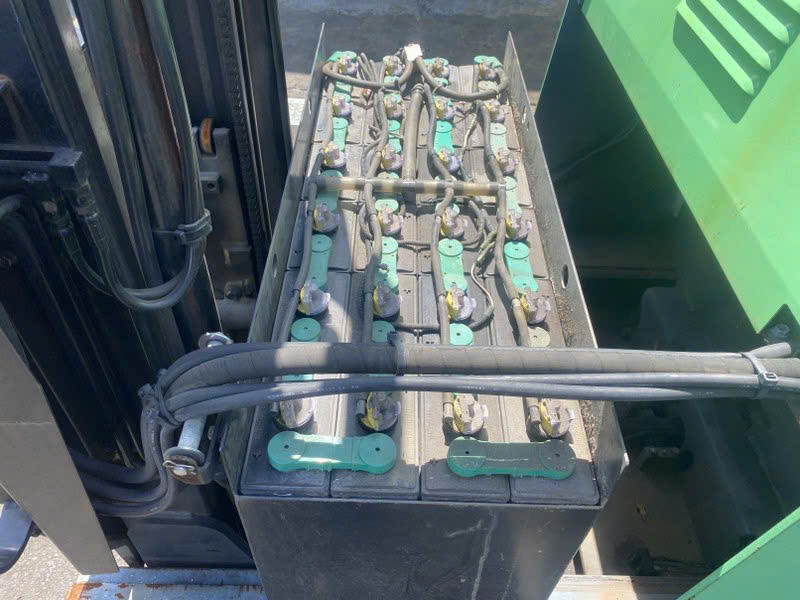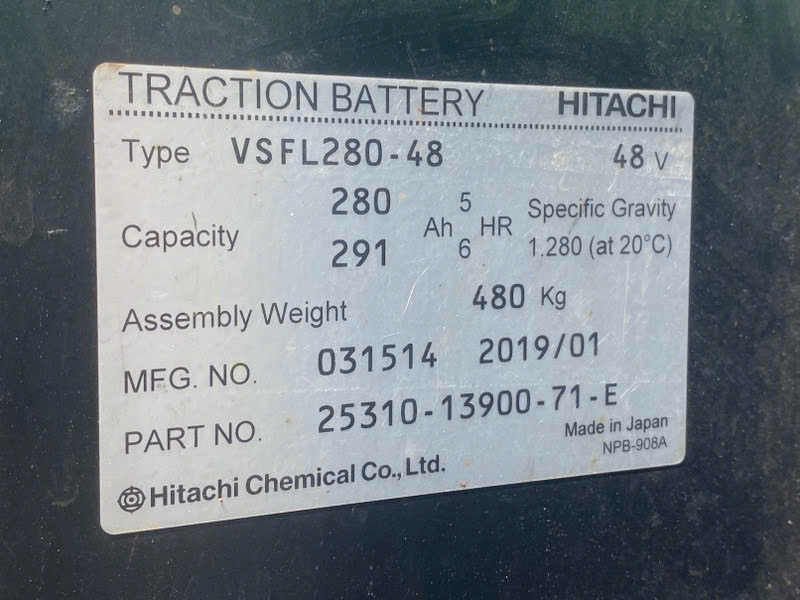 Xe nâng Toyota 7FBR15 trong hình được trang bị bình điện Hitachi VSFL280-48, một loại bình điện công nghiệp chất lượng cao, được sản xuất bởi Hitachi Chemical Co., Ltd., Nhật Bản. Hiện nay, thương hiệu này được chuyển sang Lifttop do nhà sản xuất Showa Denko Nhật Bản cung cấp.